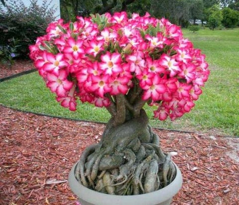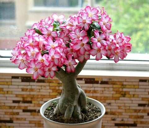 Desert Rose are a relative of the Frangipani and Oleander family and the resemblance can be seen in the flowers which can pink or reddish often with a whitish flush radiating out from the centre.