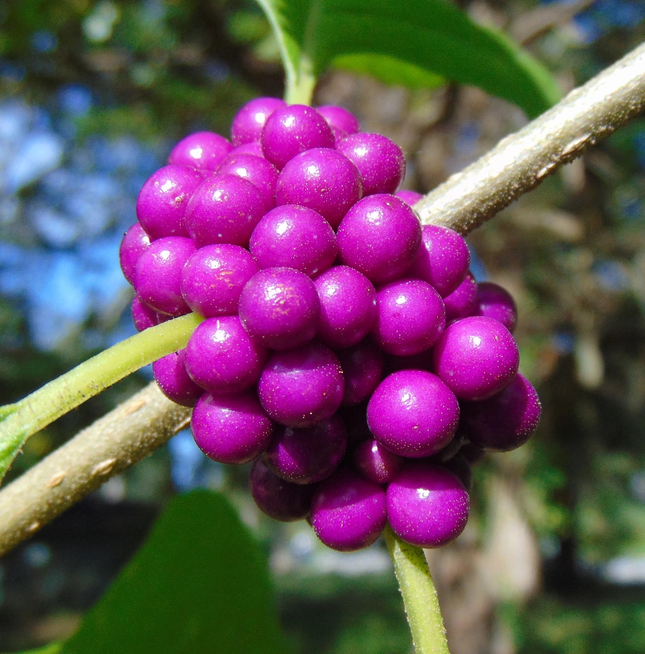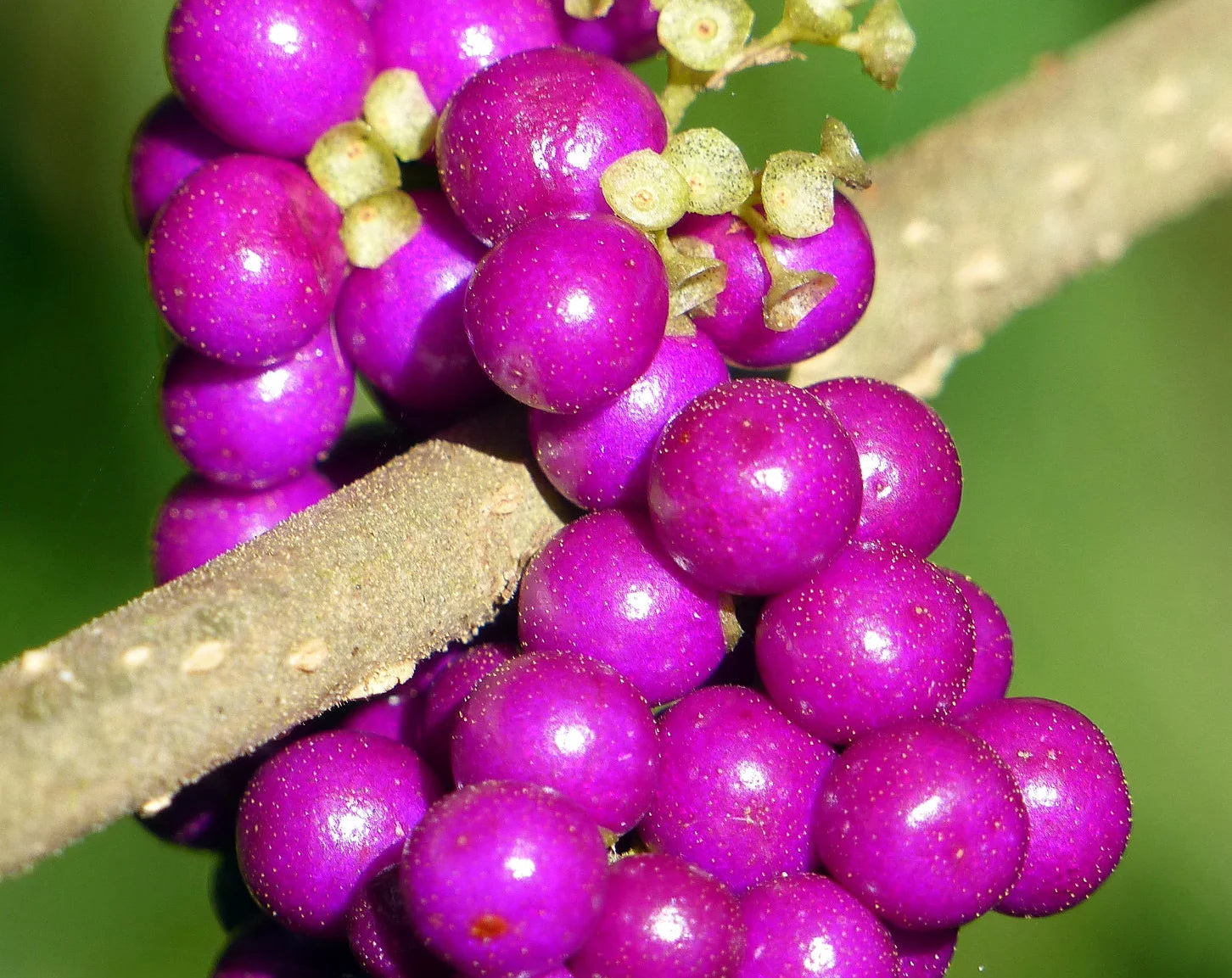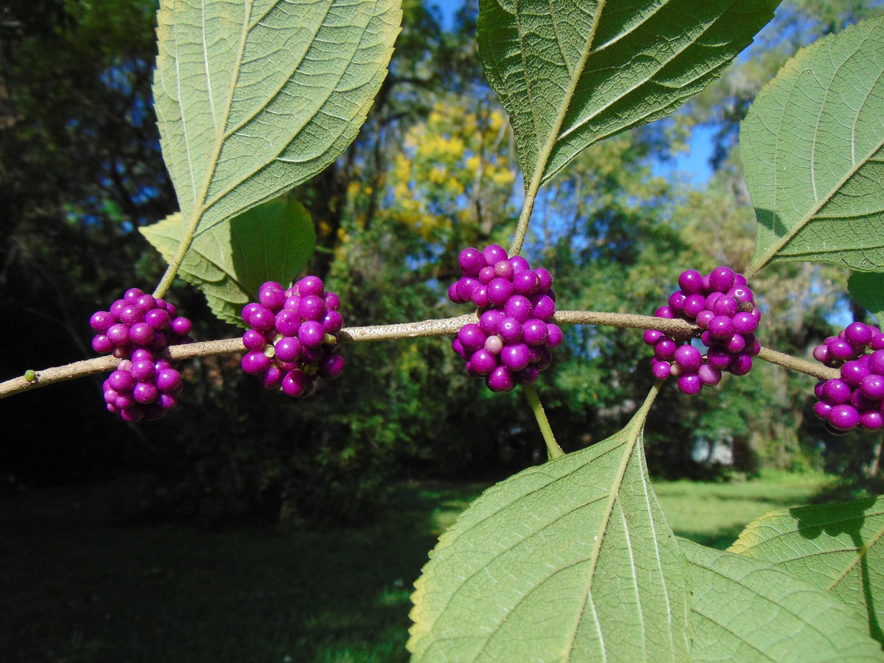 Grown for its clusters of spectacular berries that grace the plant throughout the fall and often in winter, Callicarpa americana (American Beautyberry) is a bushy, deciduous shrub with a naturally loose and graceful arching habit. Elegant with its long branches which seem to seek the ground, it bears clusters of small flowers of violet, pink, or white along its stems in early summer. Although charming, the flowers are fairly inconspicuous and not showy from a distance. Attractive to bees and butteries, they are however abundantly followed by clusters of glossy, bright violet to magenta fruits, which encircle the woody stems. These incredibly showy berries may persist after the leaves have fallen and stand out beautifully, if not completely devoured by hungry birds. Adding rich color and splendor to the fall and winter landscape, they make a lovely contrast with the foliage of elliptical, coarse, fuzzy, light green leaves, that turns yellow in fall. Easy to grow, Callicarpa americana species is native to southeastern United States.