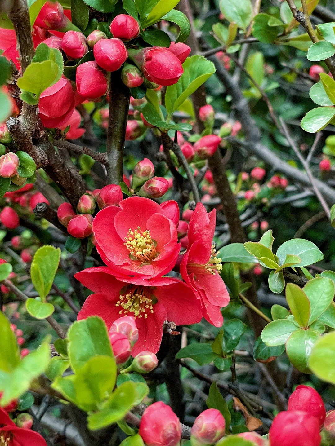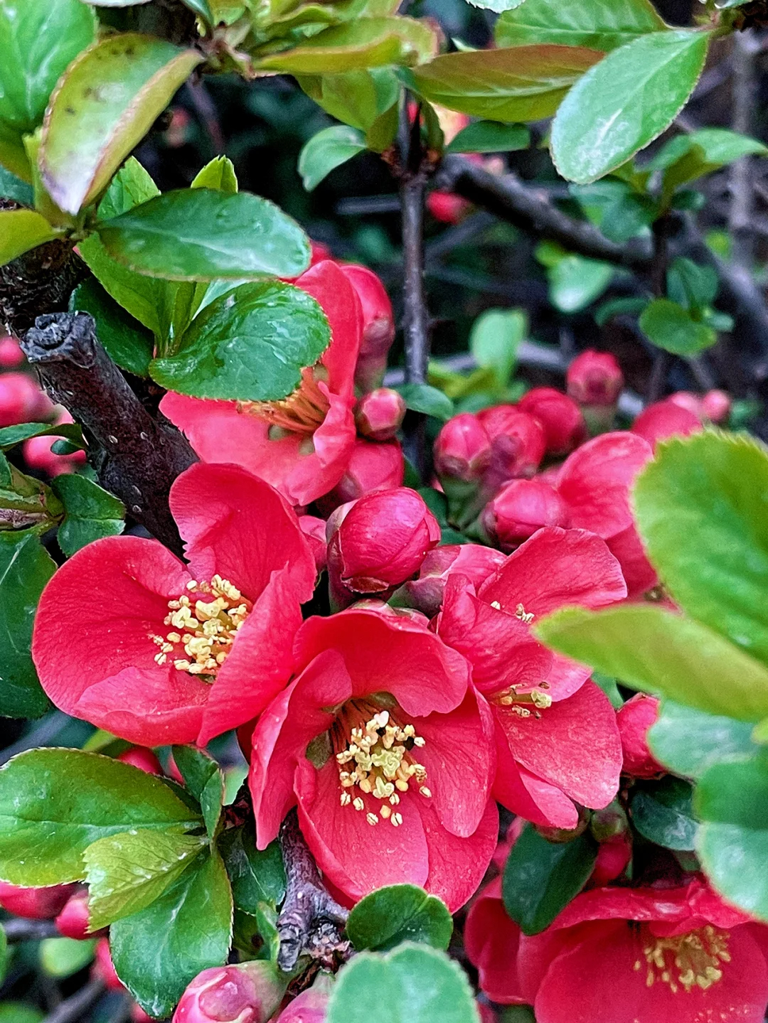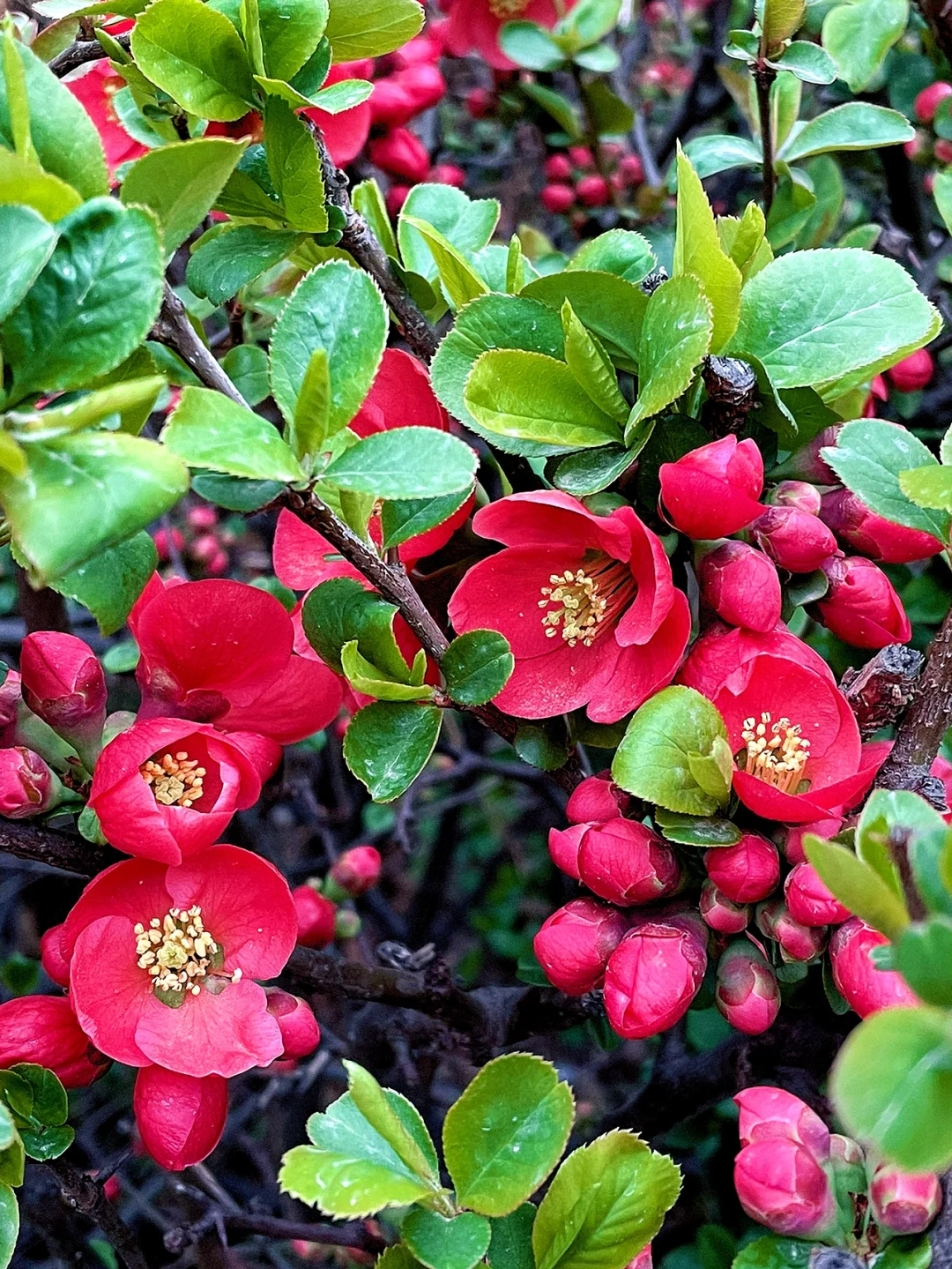 Flowering Quince is upright in nature and bears flowers in vivid crimson. Flowering Quince is a very attractive deciduous flowering shrub with a spreading and rounded habit. Leaves are glossy, ovate, and medium green up to 2-1/2 inches long. Clusters of white, pink, or crimson cup shaped flowers 1 to 2 inches across, are borne on spiny branches. Very nice for a shrub border or espalliered to wall.