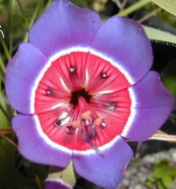 Eye candy!! Geissorhiza radians, known as "Wine Cup", is a delightful rare gem from South Africa. What the inch-wide flowers lack in size, they make up for in their dazzling color pattern of indigo-blue and ruby red, separated with a white line. These unusual blooms seem designed as a target to help pollinators aim straight toward the center! This Iris relative is uncommon in cultivation, and fresh seeds are rarely seen for sale.