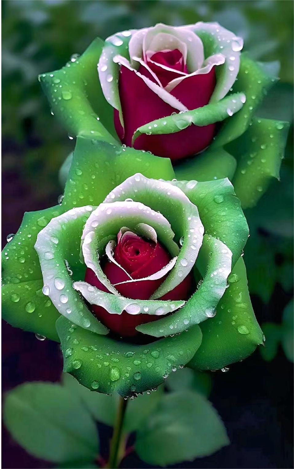 Embrace the captivating allure of Ruby Green Twin Roses and let their contrasting beauty transform your garden into a masterpiece. 🌹🍃